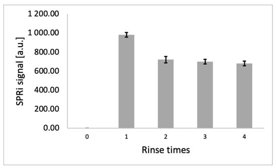 Selecting the rinse frequency prevents washing of the desired adsorbed molecules from the layers. This allows us to determine whether they are immobilized on the surface despite the use of PBS buffer. Washing is an essential step that removes unbound molecules, which may interfere with the final analytical result, from the sample matrix. To establish whether washing disrupts the structure of the adsorbed layers, the resulting SPRi signal is compared. If its value decreases or increases after washing, we observe an adverse effect of the PBS buffer on the deposited layers. To investigate the effect of rinsing on the signal obtained, an antibody was immobilized on the surface of a gold chip at Γ= 1.89 × 10−14 mol/mm2. After completing this procedure, data acquisition for the antibody layer was performed. A standard YKL-40 solution at a concentration of 10 ng/mL was then applied to the chip at each measurement site of the sensor. After 10 min, the excess YKL-40 solution was removed from the chip surface, and the chip was washed once with PBS buffer. The measurement was then performed. These steps were repeated for four rinses of the measurement surfaces. The results obtained are presented in Figure 5. The error bars shown in the figure represent the standard deviation from four independent replicates. The low standard deviations confirm the repeatability of the results (mean SD = 20.90 a.u.).