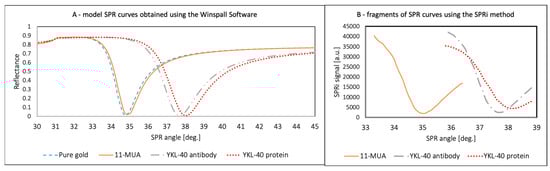 Data were acquired for the thiol layers—11-MUA, a YKL-40-specific antibody, and the YKL-40 protein—to verify whether the layers were immobilized on the sensor surface at different ranges depending on the minimum signal. The angles were within a range of 33 to 40 degrees. Each layer should have a minimum at a different SPR angle, with a tendency to present higher angles than the preceding layer.