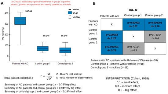 (A) graph of changes YKL-40 concentrations in plasma samples from patients with AD and two control groups. Information about the medians is placed above the box plots. (B) Dunn–Bonferroni POST-HOC graphical analysis. The boxes contain the p-parameter values and Cohen’s d values.