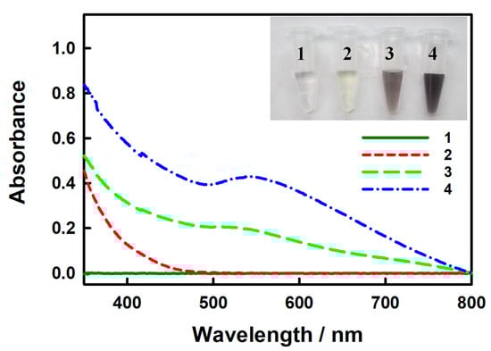 Here, we employed GOx to label Ab2 for enzyme-catalyzed gold-deposition. We monitored the color change in the enzyme-catalyzed reaction to track the reaction process by capturing pictures and recording UV-Vis absorption spectra, as shown in Figure 2, and the insert of Figure 2 shows the visual inspection results. Initially, the glucose solution was colorless and exhibited no absorption peak (curve 1). Upon adding 2 mM NaAuCl4, the solution turned faint yellow, but there was still no obvious absorption peak (curve 2). The color of the BSA/Ab2-PABA-AuNPs-GOx suspension was dark brown with a weak absorption peak at 515 nm (curve 3). After addition of the enzyme-catalyzed solution (5 mM glucose and 2 mM NaAuCl4, the final concentration) and reaction for 2 h, the BSA/Ab2-PABA-AuNPs-GOx suspension darkened further, and the absorption peak appeared at ca. 544 nm for AuNPs (curve 4). We also investigated the situation of gold staining when there are no AuNPs as seeds, shown in Figure S1. After the reaction of 2 mM NaAuCl4 and 50 µM H2O2 (used to replace the enzyme-generated H2O2 here) for 2 h without the presence of AuNPs, the absorption peak that appeared at ca. 544 nm for AuNPs is lower than that of curve 4, and we believe that the AuNPs can accelerate the gold staining.