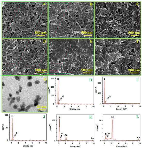 The fabrication of the IgG immunoelectrode was further characterized using SEM and EDX, with results presented in Figure 4. On the BSA/Ab1/MWCNT/GCE and antigen/BSA/Ab1/MWCNTs/GCE, nanotubes were seen, and no obvious morphological changes were observed (Figure 4A,C), probably because the protein layer was thin. On the Ab2-PABA-AuNPs-GOx/antigen/BSA/Ab1/MWCNT/GCE, the morphology of the immunoelectrode had obviously changed, proving the successful immune binding of Ab2-PABA-AuNPs-GOx to the antigen (Figure 4E). After the enzyme-catalyzed gold-staining reaction, the Ab2-PABA-AuNPs-GOx became larger, supporting that gold staining occurs only on Ab2-PABA-AuNPs-GOx. The EDX spectroscopy results for Ab2-PABA-AuNPs-GOx/antigen/BSA/Ab1/GCE (Figure 4J) and gold/Ab2-PABA-AuNPs-GOx/antigen/BSA/Ab1/GCE (Figure 4K) demonstrate an increase in both mass and Au content following the enzyme-catalyzed reaction. Compared with BSA/Ab1/MWCNT/GCE, the morphology of antigen/BSA/Ab1/MWCNTs/GCE and Ab2-PABA-AuNPs-GOx/antigen/BSA/Ab1/MWCNT/GCE did not change significantly when the antigen concentration was 0 ng mL−1 (Figure 4B,D), and the EDX spectroscopy results also indicated that there was no gold on the Ab2-PABA-AuNPs-GOx/antigen/BSA/Ab1/MWCNT/GCE (Figure 4H). All these experiments have demonstrated the successful implementation of glucose oxidase-mediated gold deposition on functionalized electrodes. Moreover, a TEM image of PABA-AuNPs-GOx was provided, as shown in Figure S3, and the size of PABA-AuNPs-GOx is ca. 10–15 nm. Finally, the successful synthesis of Ab2-PABA-AuNPs-GOx was also confirmed by transmission electron microscopy (TEM). Coupled with EDX, the size of Ab2-PABA-AuNPs-GOx is ca. 15–20 nm (Figure 4G) and the results of EDX show the presence of gold (shown in Figure S4).
