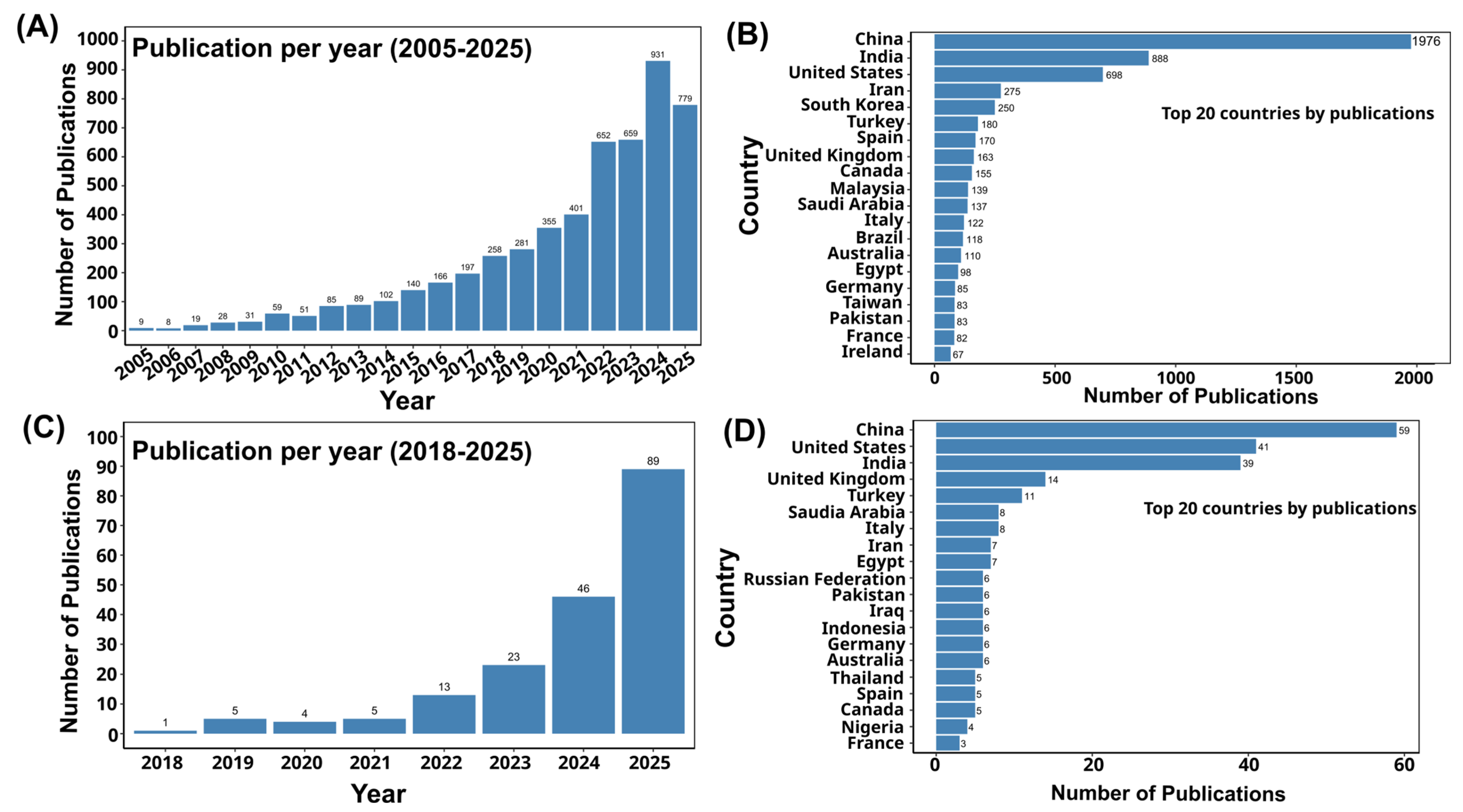 Figure 1. (A) The list of publications related to the biosensor-based detection of foodborne pathogens, which are indexed in Scopus, [Search within “all fields” and search documents using the keyword “biosensor-based detection of foodborne pathogens” from 2005 to 1 September 2025]. (B) Top 20 countries by publication related to the biosensor-based detection of foodborne pathogens. (C) The list of publications related to the artificial intelligence-based detection of foodborne pathogens, which are indexed in Scopus [Search within “all fields” and search documents using the keyword “artificial intelligence-based detection of foodborne pathogens” from 2018 to 1 September 2025]. (D) Top 20 countries by publications related to artificial intelligence-based detection of foodborne pathogens.