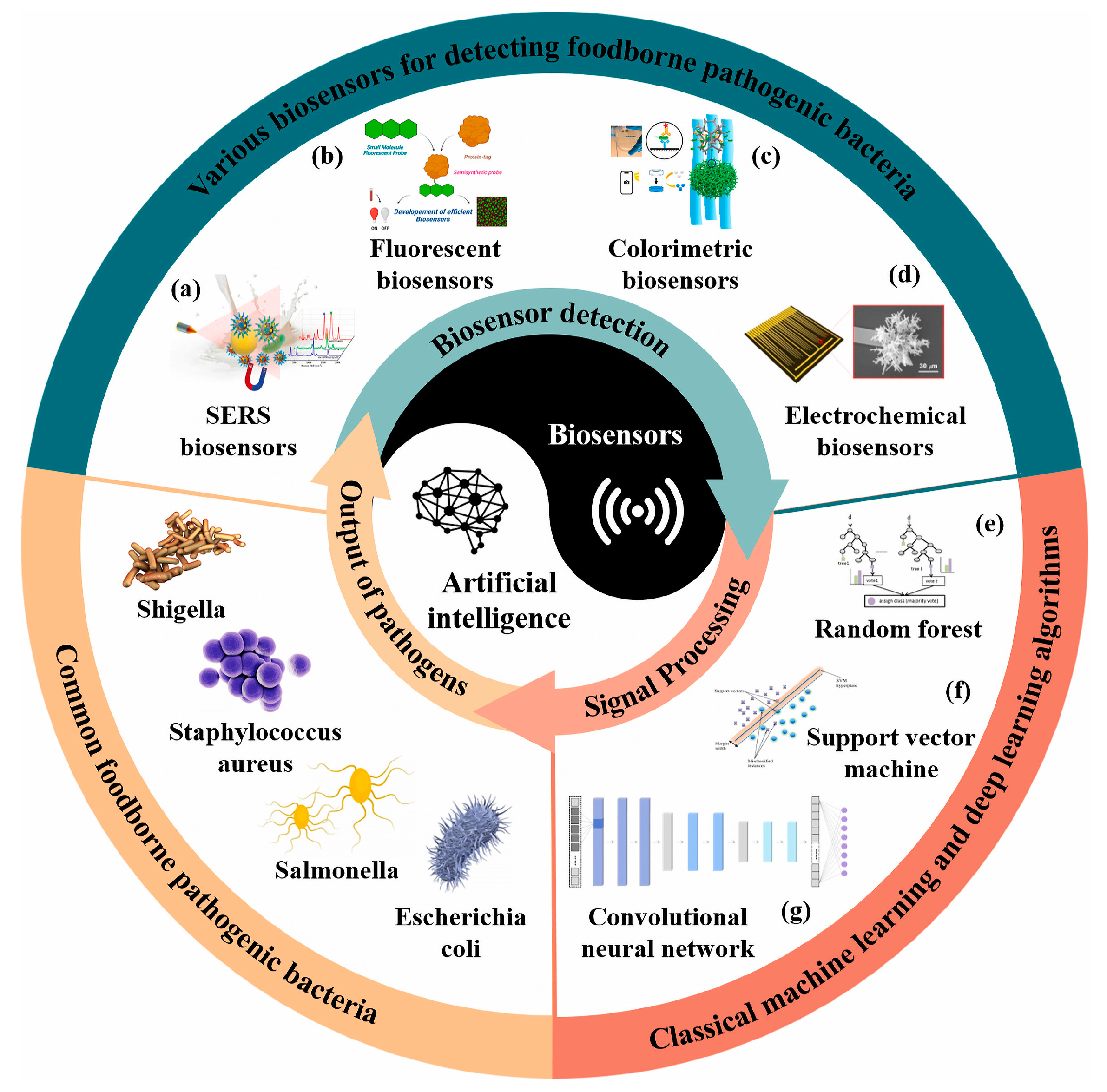 Figure 2. Conceptual framework illustrating the integration of artificial intelligence into biosensor platforms for foodborne pathogen detection. (ad) Various biosensors for detecting foodborne pathogens: (a) SERS biosensors, (b) Fluorescent biosensors, (c) Colorimetric biosensors, and (d) Electrochemical biosensors. (eg) Classical machine learning and deep learning algorithms for signal processing and pathogen classification: (e) Random forest, (f) Support vector machine, and (g) Convolutional neural network. Reprinted with permission from [150]. Copyright © 2025 Elsevier Ltd. A.