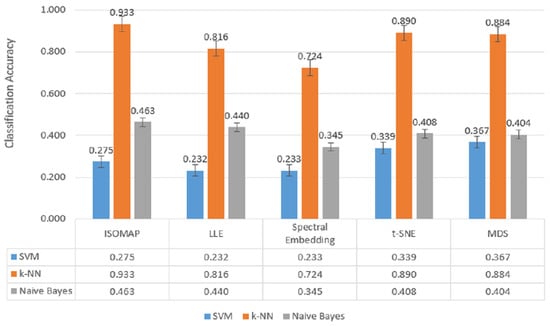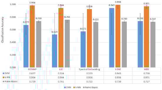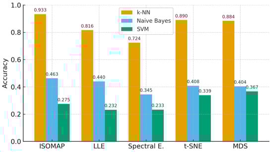 k-NN achieved 99.6% accuracy with t-SNE, 98.4% with ISOMAP, and 97.1% with MDS, outperforming both SVM and Naïve Bayes, which generally remained in the 72–76% range. These results highlight that