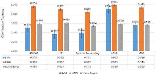 k-NN algorithm achieves the highest classification accuracies among all dimensionality reduction methods. Especially when used with ISOMAP (79.3%) and t-SNE (79.7%) methods,