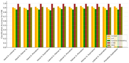 Classification analyses performed after the t-SNE dimensionality reduction method revealed that the k-NN algorithm showed the highest performance with accuracy rates close to 99% in all motor task pairs. Especially in the “Hand O.-Supination”, “Lateral G.-Supination”, and “Palmar G.-Supination” task pairs, accuracy values exceeding 99.6% show that k-NN can perform a near-perfect separation between classes in the feature space obtained with t-SNE. In this scenario, the SVM model exhibited a competitive performance with high accuracy values (89–94%), unlike other dimensionality reduction methods. The Naive Bayes model, on the other hand, showed stable success in the range of 72–83%, but fell behind k-NN and SVM. These findings show that the classification algorithm that best fits the feature representation after t-SNE is k-NN, SVM demonstrates a significant performance increase in this method, while Naive Bayes offers relatively stable but limited performance.