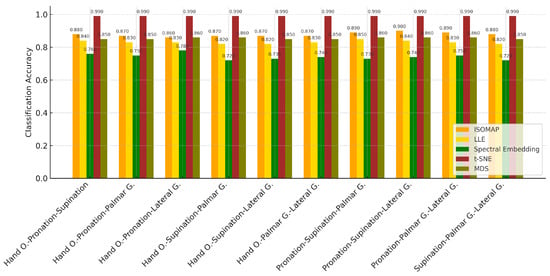 Classification analyses performed after the MDS dimensionality reduction method revealed that the k-NN algorithm was the most effective model by achieving the highest accuracy rates in all motor task pairs. Especially in task pairs such as “Lateral G.-Supination” (96.2%) and “Pronation-Supination” (94.4%), k-NN provided over 94% accuracy and demonstrated a high discrimination capacity between classes. The Naive Bayes model generally provided stable results in the 74–85% accuracy range and became a competitive alternative by surpassing SVM in some tasks. Although SVM exhibited a more balanced performance with the MDS method, it achieved low accuracy in some task pairs, especially in “Palmar G.-Supination” (61.5%). These findings show that k-NN is the most reliable classification algorithm in data reduced by the MDS method, Naive Bayes provided balanced but limited success, and SVM lagged behind k-NN with partial improvements.