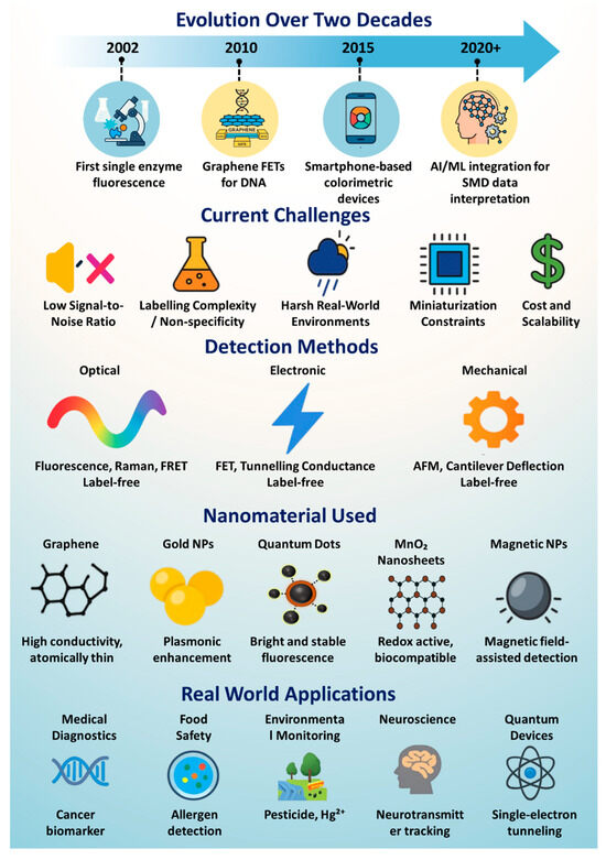 However, detecting a single molecule is no simple feat. Molecules are incredibly small, typically a few nanometers in size, and interact weakly with their surroundings. They often exist in minute concentrations, behave unpredictably in complex environments like blood or soil, and produce signals that are easily drowned out by background noise [8,9]. As a result, SMD systems must achieve extraordinary sensitivity, typically at the femtomolar (10−15 M) or attomolar (10−18 M) level, while also ensuring specificity, stability, and real-time responsiveness. Achieving this balance requires a combination of innovative detection principles and cutting-edge materials that can transduce molecular events into measurable signals [10]. To meet these challenges, a wide variety of physical and chemical mechanisms have been developed for SMD. These include optical techniques that rely on light–matter interactions (such as fluorescence and Raman scattering), electronic approaches that detect changes in current or voltage (such as transistor-based sensing or tunneling), and mechanical systems that translate molecular binding into force-induced responses [11,12,13,14]. Each method brings unique advantages in terms of speed, resolution, label-free operation, or multiplexing capabilities [15,16,17,18]. The choice of technique often depends on the specific application—whether the goal is to study a protein in solution, detect a contaminant in food, or monitor DNA hybridization on a chip [19]. To contextualize this progress, Figure 1 summarizes the integrated landscape of SMD, highlighting its two-decade evolution, prevailing challenges, detection strategies, enabling nanomaterials, and real-world applications. This schematic serves as a roadmap for understanding the technological trajectory and multidisciplinary scope of the field.