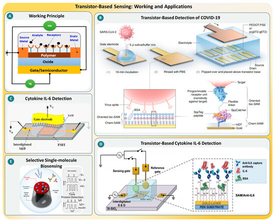 (A) Basic working principle of a transistor-based biosensor using gate modulation through analyte–receptor interaction. (B) Transistor-based COVID-19 detection using saliva samples and a self-assembled monolayer interface, taken from [63], with the permission of Springer. (C) Schematic of IL-6 cytokine detection using a dual-gate transistor sensor with SAM/anti-IL-6-modified gold electrodes, taken from [64], with the permission of Wiley. (D) Transistor-based detection of C-reactive protein using interdigitated electrodes and functionalized gate materials, taken from [65], with the permission of Springer. (E) Concept of selective single-molecule biosensing using nanopore-transistor integration for DNA/protein identification, taken from [66], with the permission of Springer.