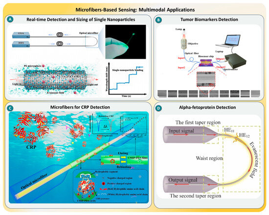 (A) Microfiber-based real-time detection and sizing of single nanoparticles via evanescent field interactions, taken from [75], with the permission of Elsevier. (B) Optical microfiber biosensor setup for tumor biomarker detection using dual-input/output fiber configuration, taken from [75], with the permission of ACS. (C) Schematic of CRP detection using CMIP-PDA-functionalized opt−cal microfiber with specific rebinding regions, taken from [76] with the permission of Elsevier. (D) Structural design of a microfiber sensor for alpha-fetoprotein detection using a tapered fiber configuration, taken from [77] with the permission of SSRN.