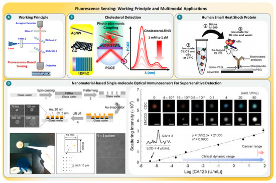 (A) Basic working principle of a fluorescence detection system using excitation and emission filters. (B) Fluorescence-based cholesterol sensing via photo-plasmonic coupling and emission enhancement, taken from [84] with the permission of ACS. (C) Detection of human small heat shock protein using fluorescence−tagged immunoassay with microfluidic incubation, taken from [85] with the permission of Elsevier. (D) Nanopatterned optical immunosensor platform for ultrasens−tive SMD of CA125 cancer biomarker, taken from [86] with the permission of Elsevier.