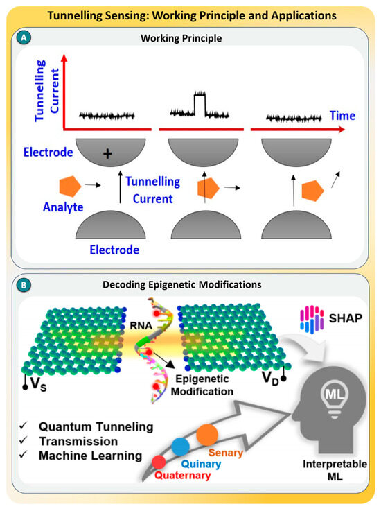 (A) Illustration of the tunneling current principle, where analyte passage between electrodes generates measurable electrical signals. (B) Direct RNA sequencing using quantum tunneling combined with machine learning for decoding epigenetic modifications, taken from [103] with the permission of ACS.