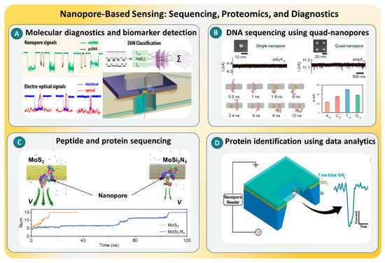 Pal et al. [109] developed an amplification-free solid-state nanopore assay for mitochondrial DNA quantification directly from cancer and blood samples, achieving >95% classification accuracy without PCR bias, as illustrated in Figure 9A. Hu, Rui et al. [110] introduced a quad-nanopore array, shown in Figure 9B, that slowed translocation about fivefold and discriminated DNA homopolymers with a single-nucleotide resolution at low bias. Zhang et al. [111] employed MoSi2N4 nanopores to regulate peptide mobility for high-fidelity protein sequencing, as represented in Figure 9C, while Dutt et al. [112] integrated solid-state nanopores with advanced pattern recognition algorithms for accurate protein identification (Figure 9D). In addition, Motone et al. [113] achieved the multi-pass reading of intact protein strands using a motor-assisted nanopore system, marking a major step toward complete protein sequencing. These works discuss innovations in materials, architecture, and data analytics that are propelling nanopore-based SMD toward comprehensive, high-precision molecular diagnostics.