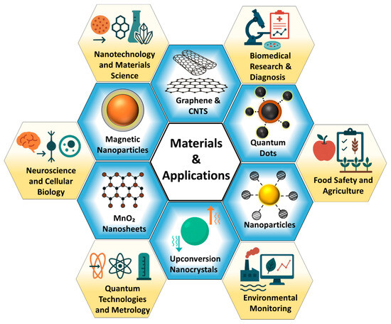 Alongside advances in detection principles, the development of emerging nanomaterials has played a pivotal role in enhancing the performance of SMD platforms [20,21,22]. Materials such as graphene, carbon nanotubes, gold nanoparticles, quantum dots, and magnetic nanostructures bring exceptional electrical, optical, and surface properties that make them ideal for sensing applications. Graphene’s single-atom thickness and outstanding conductivity improve charge-based sensing, while gold nanoparticles enhance optical signals through localized surface plasmon resonance. Quantum dots offer high-brightness and stable fluorescence, making them excellent for long-term single-molecule tracking [23,24,25]. Moreover, 2D nanosheets like MnO2 and upconversion nanocrystals are being integrated into sensors to operate in biologically relevant environments without sacrificing performance. These materials not only increase the sensitivity and selectivity but also enable miniaturization, multiplexing, and compatibility with microfluidic and wearable platforms [26].