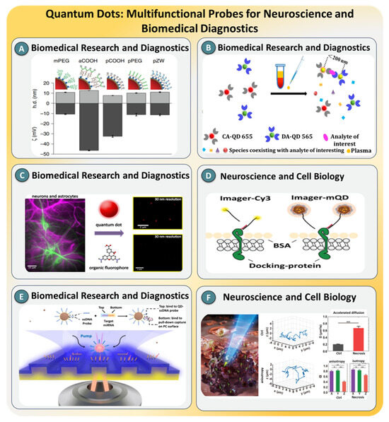 Representative case studies demonstrating the versatility of QD-based platforms for SMD. (A) Surface charge and hydrodynamic diameter variation across PEG-modified QDs for optimized biomedical targeting, reprinted with permission from Ref. [142], Nature. (B) Dual−color QD assay for detection of analytes in plasma amid coexisting species with high specificity, reprinted with permission from Ref. [144], ACS. (C) Multicolor QDs enabling high-resolution imaging of ne−rons and astrocytes with superior spatial clarity over organic dyes, reprinted with permission from Ref. [145], ACS. (D) QD-based single-particle tracking for mapping of membrane–protein interactions in live cells, reprinted with permission from Ref. [146], Nature. (E) QD-mediated microfluidic chip for miRNA detection using dual-probe hybridization and optical pumping, reprinted with permission from Ref. [147], Nature. (F) QD-assisted diffusion analysis for probing of cellular necrosis, highlighting changes in intracellular transport behavior, reprinted with permission from Ref. [148], ACS.