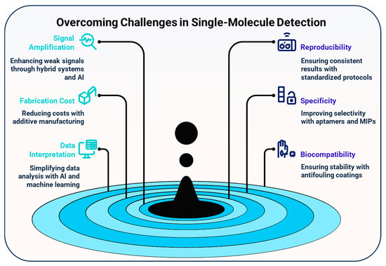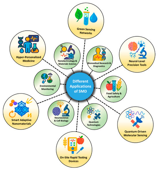 The value of SMD extends far beyond the laboratory. In the real world, it is emerging as a powerful tool for health, safety, and sustainability. In medical diagnostics, SMD is enabling the detection of cancer biomarkers, viral particles, or proteins in blood or saliva at very early stages, long before symptoms appear [27,28,29,30]. In environmental monitoring, single-molecule sensors are capable of identifying hazardous pollutants like mercury ions, pesticides, or microplastics at trace levels, helping to prevent long-term ecological damage. In food safety, SMD techniques are being used to detect allergens and bacterial contamination in complex food samples, ensuring better consumer protection [31,32,33]. Even in neuroscience and cell biology, these tools are helping scientists to understand the behavior of individual cells and neural pathways in unprecedented detail. Beyond biology, SMD is influencing quantum technologies by detecting single photons or electrons, paving the way for ultrasensitive measurement and imaging systems. Collectively, these applications demonstrate the social and environmental relevance of SMD, empowering fields that directly affect public health, food security, and ecological resilience [34,35,36].