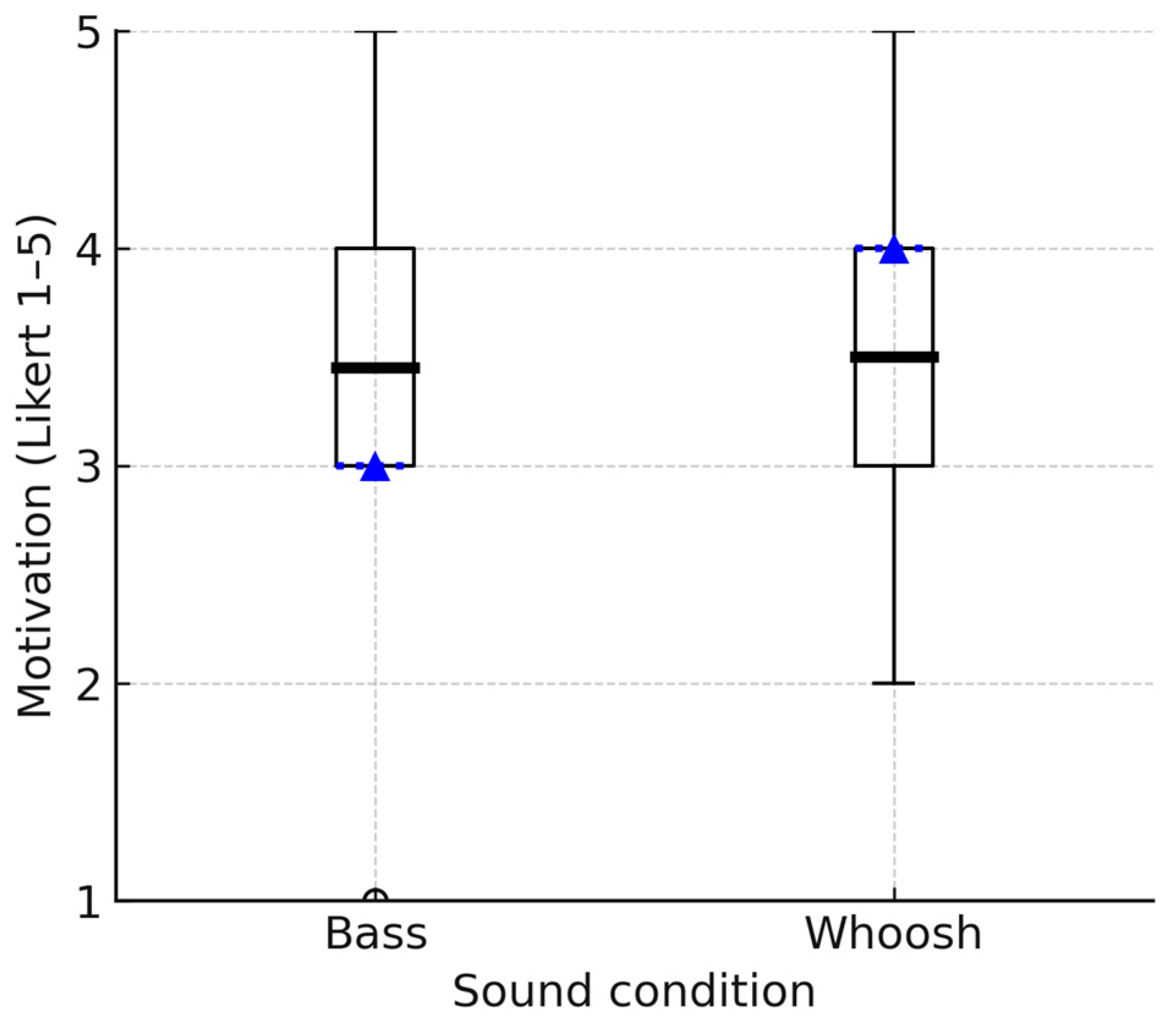 | Continuous (Whoosh) | Rotation (°) | Motivation (1–5) | 0.162 | 0.017 | Spearman | 0.158 | 0.507 | [−0.329, 0.617] |
