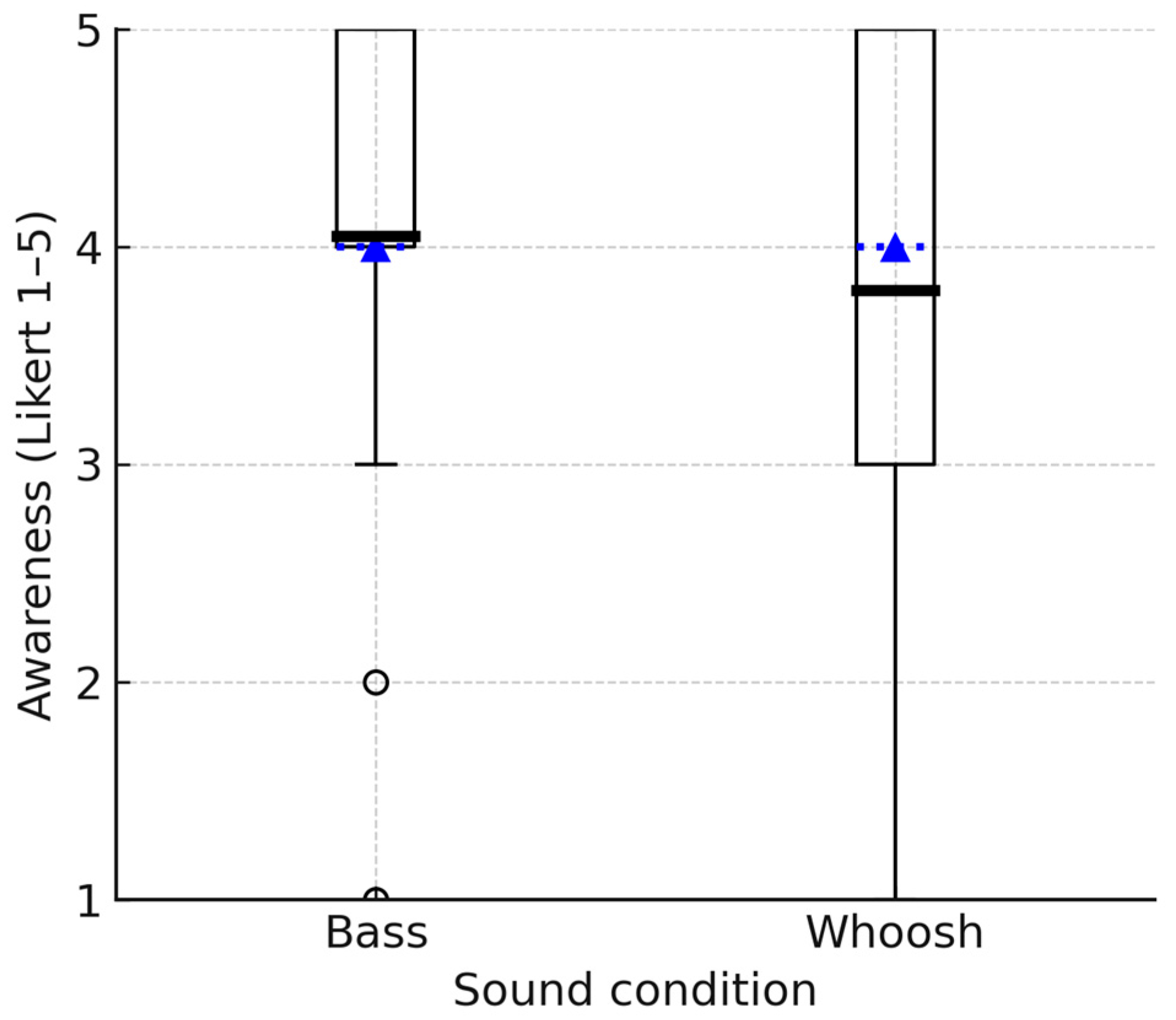 | 3.9 km/h | Discrete (Bass) | Rotation (°) | Awareness (1–5) | 0.12 | 0 | Spearman | −0.329 | 0.157 | [−0.759, 0.171] |