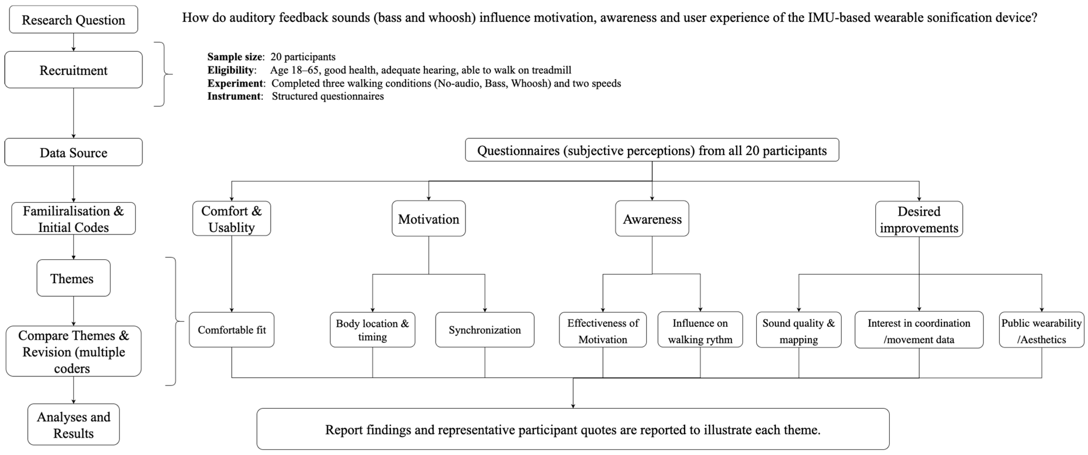 - Theme 2: the influence on walking rhythm. For example, 40% reported that the bass sound increased their awareness of the timing of foot strike and gait cycle. However, the timing did not align well with their natural rhythm. One participant stated: “It makes me aware of my gait cycle and foot strike—didn’t change my motivation to participate in walking” (P7). Another 45% noted that the whoosh sound disrupted their rhythm or made it difficult for them to align with the sound. Another participant stated: “I felt like a distraction than walking. I couldn’t tie my walking to the sound as it felt random. I think I lost a bit of concentration” (P8).