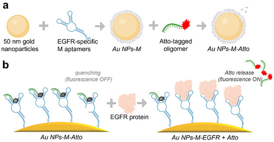 The synthesized colloidal nanoparticles were functionalized using a stepwise protocol involving biomolecular components, aiming to create a competitive plasmonic sensing system, as schematized in Figure 1. Two types of DNA oligomers containing specific sequences and therefore specific functionalities were used: an EGFR-specific aptamer (M) chosen for its affinity toward the EGFR protein and a complementary DNA strand labelled with Atto647N fluorophore (Atto), used to monitor the binding–unbinding dynamics to/from the M aptamer via fluorescence.