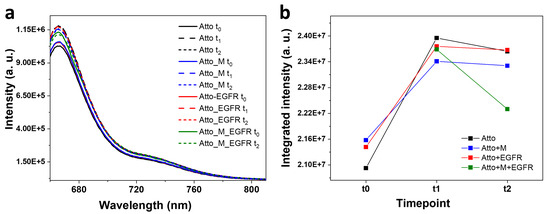 (a) Fluorescence emission spectra characteristic to Atto recorded at various time moments and conditions: in isolation, in the presence of the M aptamer, in the presence of the EGFR ligand, and in the presence of both the aptamer and the EGFR ligand. (b) The integrated intensity under the emission band calculated at each time moment: at t0, after 1 h incubation—t1, respectively 2 h after incubation—t2.