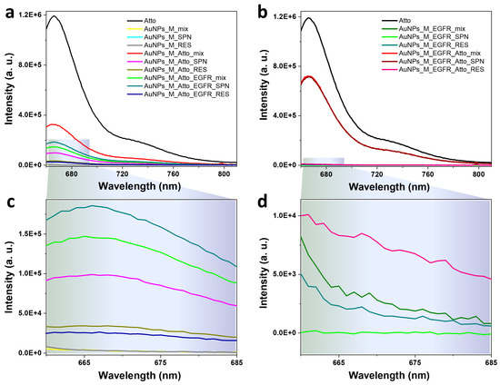 This second experimental run, referred to as Protocol A′, followed the identical stepwise incubation and washing approach: incubation with aptamer, Atto, and EGFR, with washing and centrifugation after each step. This allowed a direct comparison to the previous results. However, as presented in Figure 5a,c, the fluorescence data obtained from Protocol A′ exhibited significantly different behaviour compared to the results from Protocol A. The mix sample obtained after incubating the AuNPs with the aptamer and the fluorophore showed a 142% increase in fluorescence intensity compared to Atto alone. This enhancement could suggest plasmon-enhanced fluorescence, possibly due to reduced non-radiative deactivation pathways when the fluorophore interacts with the aptamer-functionalized AuNPs. A possible explanation for the large modification observed in the fluorescence signal compared to Protocol A can be related to small changes in spacer length or aptamer conformation, which can flip a dye from the quenching to enhancement regime, as fluorescence enhancement is extremely distance-dependent [54]. However, after centrifugation, the SPN sample exhibited a further 23% increase in fluorescence compared to the mix sample, likely due to the free Atto molecules in solution. In contrast, the RES sample presented a drastic 93.7% decrease in intensity, suggesting that very few Atto molecules remained attached to the AuNP surfaces. Additionally, considering the results obtained from Protocol A (see Figure 3), fluorophore molecules experience fluorescence quenching in the vicinity of the metallic surface, a result contrasting with the currently discussed data. These results may indicate that, in this case, the binding between the fluorophore and the AuNPs–M complex is very weak.
