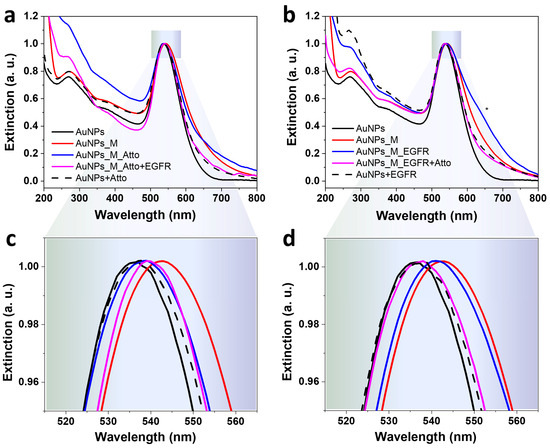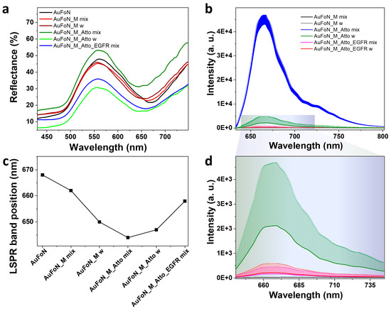 First, the AuFoN substrate was investigated using reflectance spectroscopy following each incubation step, and the spectra are given in Figure 9a. The plasmon resonance in the AuFoN is indicated by the reflectance minimum observed here in the 650–660 nm range and shown in Figure 9c. Note that the optical response of the AuFoN system can be broadly adjusted through the nanosphere size and gold film thickness [59]. The polystyrene nanosphere diameter of 500 nm and gold film thickness of 120 nm were selected to obtain the plasmon resonance in the 600–700 nm spectral range, matching the fluorophore emission. Interestingly, the AuFoN substrate exhibits a blue-shift of the LSPR minimum upon incubation with biomolecular layers, contrarily to the AuNPs, which, typically, present a red-shifted absorption maximum. Previously, negative surface plasmon resonance signals were reported when the ligand immobilized on the surface underwent a significant conformational transition upon analyte recognition, such as folding or stretching [60]. Negative refractive index increment deviations were observed both in solutions and on substrates for protein binding and aptamer folding. The blue-shift was assigned to a negative complex (ligand/analyte) refractive index increment (RII) deviation from the sum of the RII of the individual entities [61]. Therefore, the observed shift in our spectra after aptamer incubation confirmed its immobilization onto the surface. The functionalization with Atto presented an additional LSPR shift indicating that the dye-labelled oligomer was successfully added to the system. The incubation with the EGFR induced a slight red-shift of the plasmon band compared to the Atto incubation, confirming interaction or surface proximity. These modifications indicate the biochemical functionalization was induced as expected.