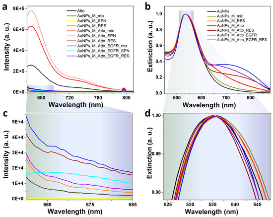 (a,c) Fluorescence emission spectra and (b,d) UV–Vis extinction spectra characteristic to the AuNP-based system obtained using Protocol A′ (repeated incubation and washing protocol using a new batch of colloidal NPs). Panels (c,d) show zoom-in details of the spectra in panels (a,b).