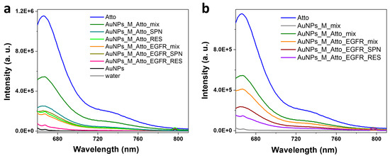 Figure 6a presents the fluorescence spectra characteristic to the system obtained using Protocol B. When Atto was added to aptamer-functionalized AuNPs, the fluorescence decreased as expected, due to quenching by the AuNPs. The fluorescence signal corresponding to the RES sample showed an over 50% decrease compared to Atto alone, indicating removal of the free or weakly bound fluorophore molecules. Following EGFR incubation and a final wash, the fluorescence dropped by another 36%. The RES sample showed minimal emission, while the SPN sample showed a 22% increase in intensity compared to the unwashed mix, suggesting that Atto was partially displaced by the EGFR and remained unquenched in the supernatant. For the system obtained using Protocol C, which involved only a final washing step, the fluorescence spectra are presented in Figure 6b. It can be observed that the trend detected for Protocol B persisted in this case, as well. The initial fluorescence of the AuNPs–aptamer–Atto system was strong, but decreased by 25% after EGFR protein incubation. The RES sample presented a further slightly diminished signal, while the SPN sample exhibited an increase in intensity compared to the corresponding RES sample, indicating that even in this minimally handled system, EGFR displaces Atto, leading to signal redistribution and potential detectability in the supernatant.