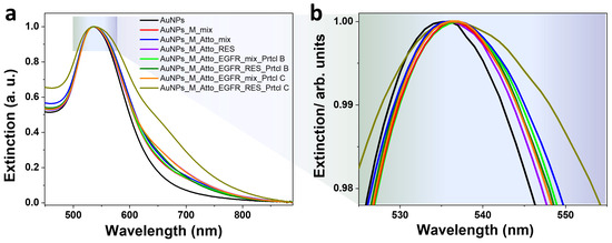 (a) UV–Vis extinction spectra characteristic to the AuNP-based systems obtained using Protocol B and Protocol C. (b) The panel presents a zoom-in detail of the spectra.
