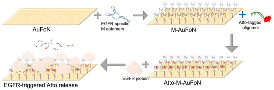 Given the reproducibility challenges and signal instability encountered with colloidal AuNPs, the study was extended to investigate plasmonic nanostructured substrates. Specifically, AuFoN was employed as an alternative sensing surface. These platforms offer higher stability and allow more controlled surface chemistry and repeated handling. Additionally, substrates are selected for biosensing due to their unique optical properties, including LSPR and increased electromagnetic fields, which can contribute to fluorescence signal enhancement [57]. Their large surface area and tunable morphology makes them promising candidates for biosensing applications [14,58]. The experimental procedure was maintained to allow direct comparison with the colloidal AuNPs; therefore, the same functionalization sequence was applied: successive incubation with the M aptamer, the Atto fluorophore-labelled complementary strand, and the EGFR protein, with washing steps after each stage. A schematic of the surface modification workflow is shown in Figure 8.