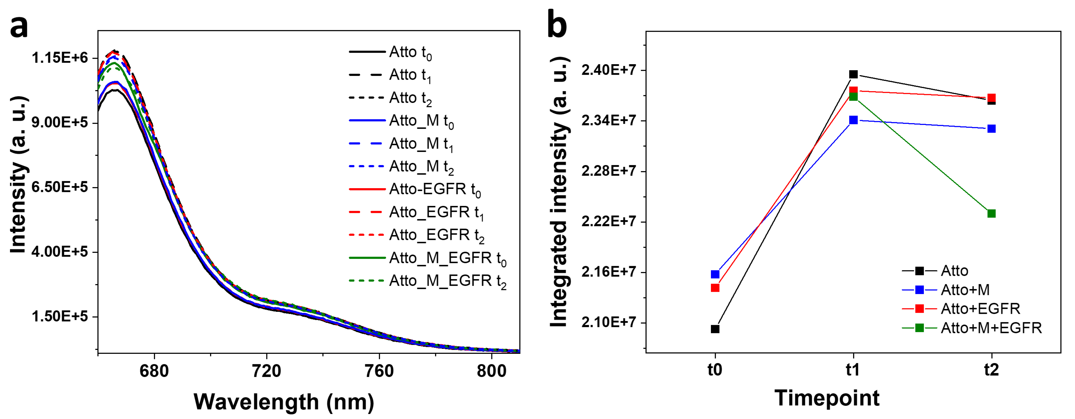 To establish a reference for subsequent nanoparticle-based experiments, an initial set of measurements was conducted to assess the fluorescence behaviour of the Atto-tagged oligomer in various biological environments. It was incubated under four conditions: (i) alone in solution, (ii) together with the M aptamer, (iii) together with the EGFR protein, and (iv) with both the aptamer and the protein. Fluorescence spectra were recorded at defined time intervals (t