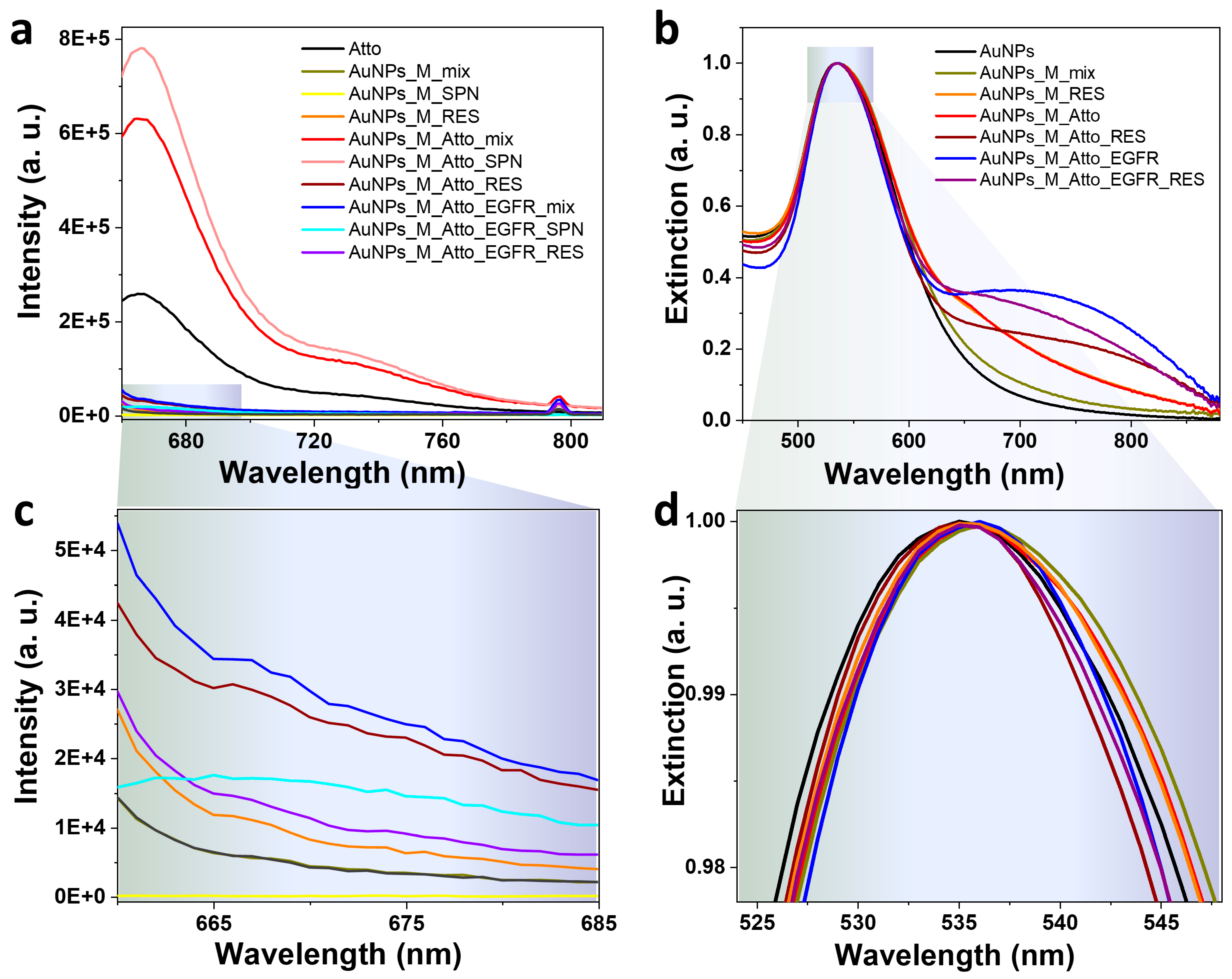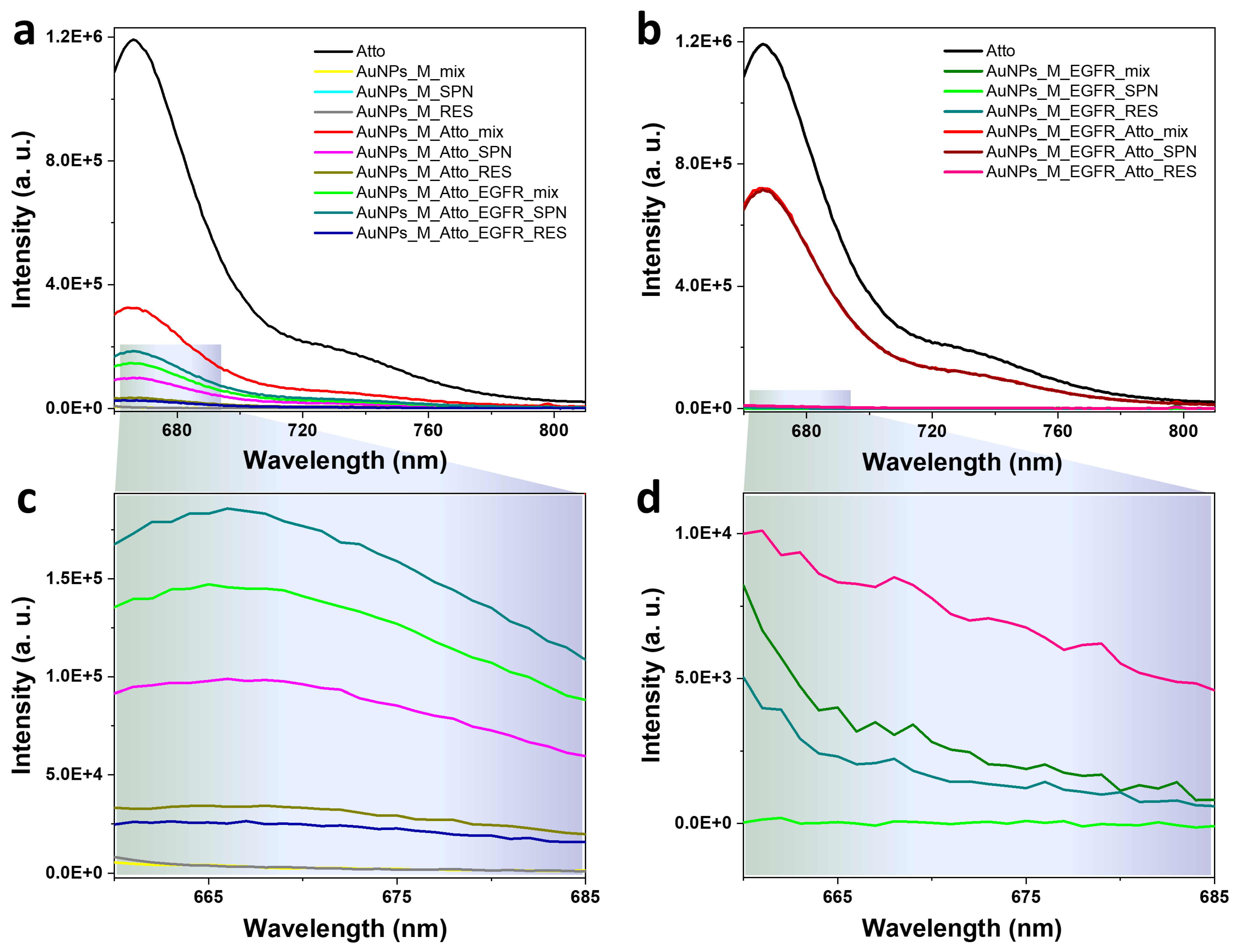 REV) was conducted in which AuNPs functionalized with the aptamer were first incubated with EGFR, followed by addition of the Atto fluorophore. The resulting spectra (