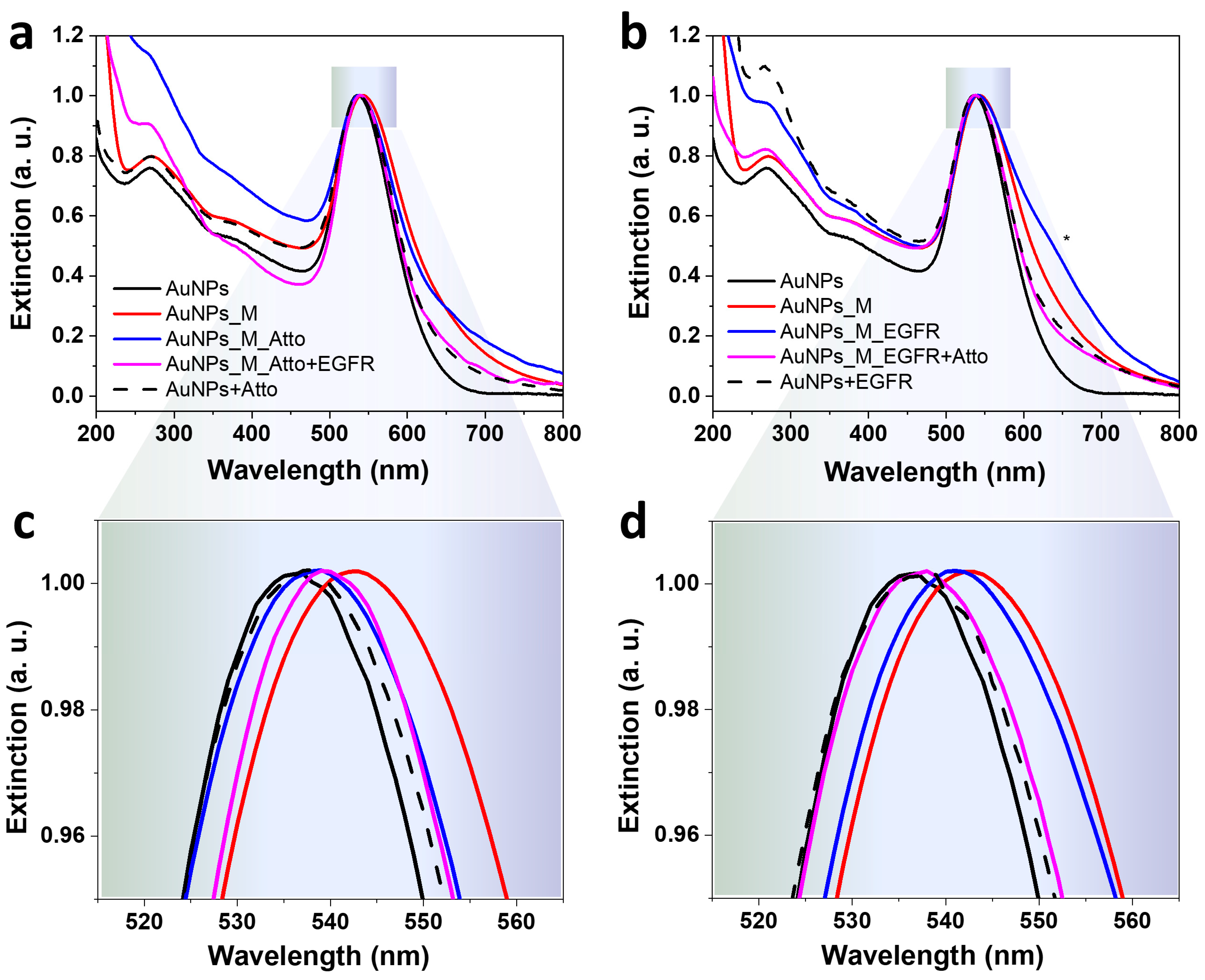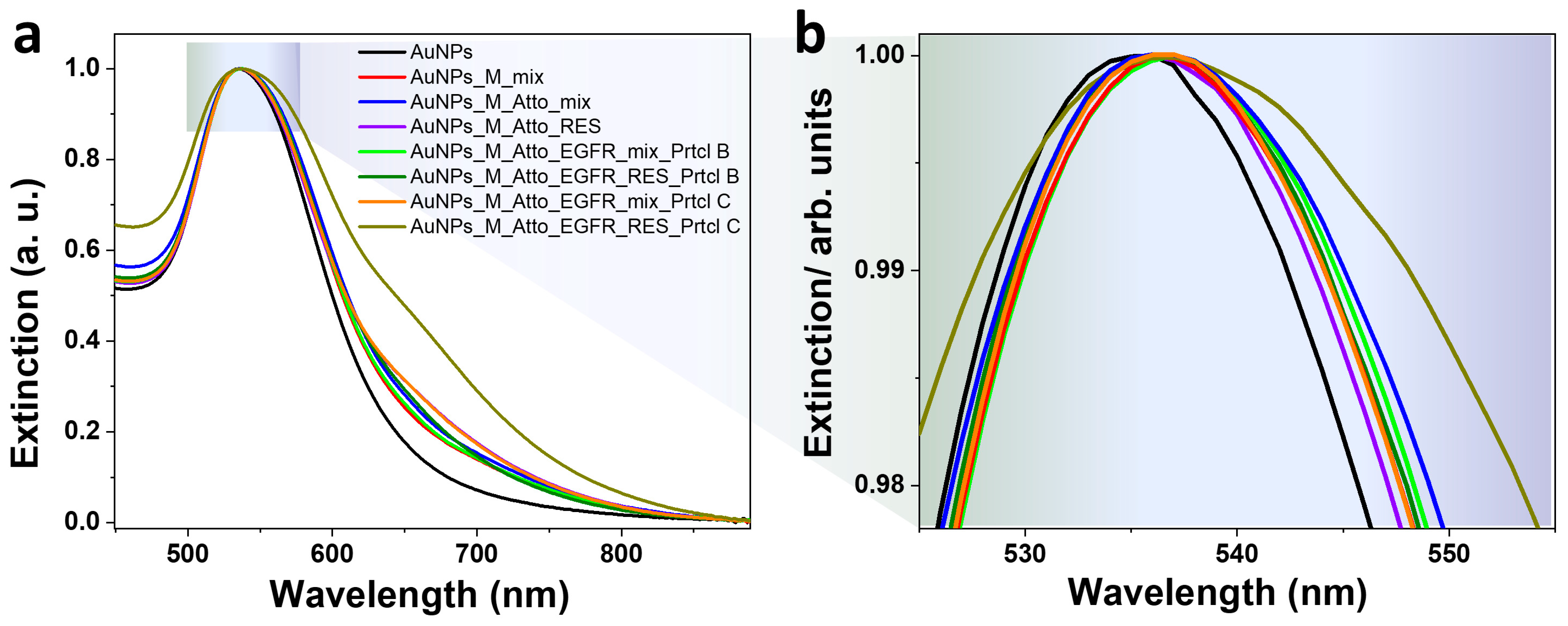 61]. Therefore, the observed shift in our spectra after aptamer incubation confirmed its immobilization onto the surface. The functionalization with Atto presented an additional LSPR shift indicating that the dye-labelled oligomer was successfully added to the system. The incubation with the EGFR induced a slight red-shift of the plasmon band compared to the Atto incubation, confirming interaction or surface proximity. These modifications indicate the biochemical functionalization was induced as expected.