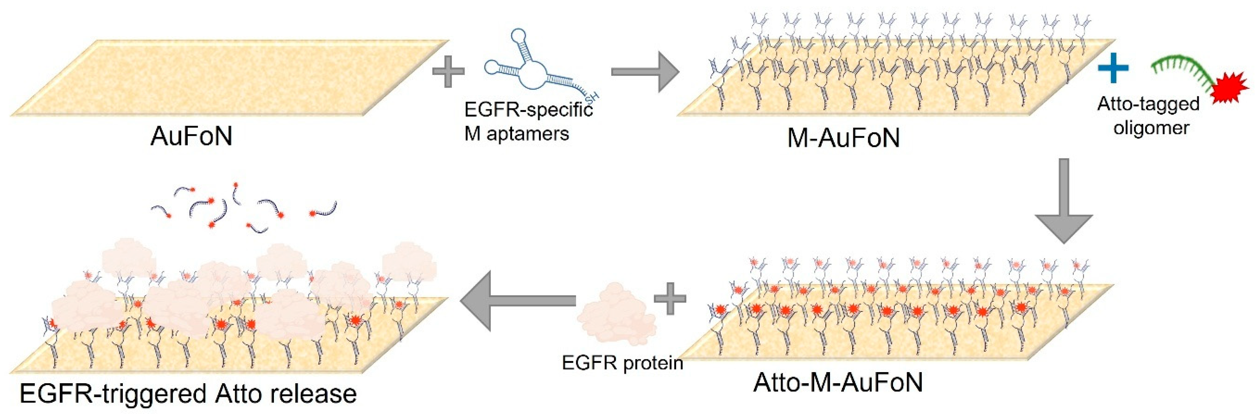 58]. The experimental procedure was maintained to allow direct comparison with the colloidal AuNPs; therefore, the same functionalization sequence was applied: successive incubation with the M aptamer, the Atto fluorophore-labelled complementary strand, and the EGFR protein, with washing steps after each stage. A schematic of the surface modification workflow is shown in