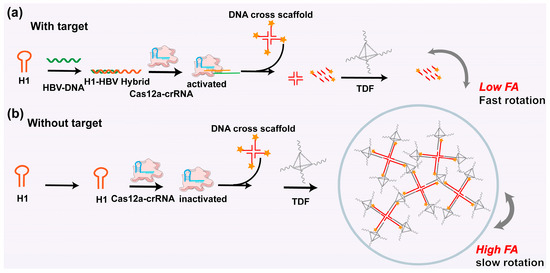 The detection principle is shown in Figure 1. First, TDF- and TAMRA-modified DNA cross scaffolds were pre-synthesized. When the target HBV-DNA was present, the hairpin H1 opened, and the exposed single-stranded portion of the scaffold activated CRISPR/Cas12a trans-cutting. The CRISPR system sheared the single-stranded portion of the DNA cross scaffold into small fragments with significantly smaller masses (or volume) and faster rotational speeds in the solution, resulting in a noticeably reduced r of TAMRA. In contrast, when the target HBV-DNA was absent, the CRISPR system was not activated because H1 did not open. At this time, the DNA cross scaffold remained intact and bound to the TDF as an assembly with a large mass (or volume) and slow rotation speed, and r of TAMRA was enhanced greatly. Therefore, sensitive detection of HBV-DNA was realized by a significant change in the r signal.