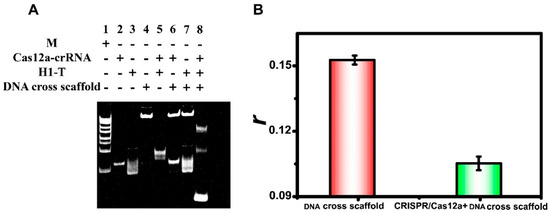 (A) PAGE analysis using a 12% gel. M is the marker and T is HBV-DNA. (B) Changes in r of the DNA cross scaffold before and after the addition of CRISPR/Cas12a. Each measurement was performed in triplicate (error bars indicate the standard deviation). Concentrations were as follows: HBV-DNA, 5 nmol/L; Cas12a, 10 nmol/L; crRNA, 10 nmol/L; TDFs, 50 nmol/L; DNA cross scaffolds, 50 nmol/L; and H1, 50 nmol/L.