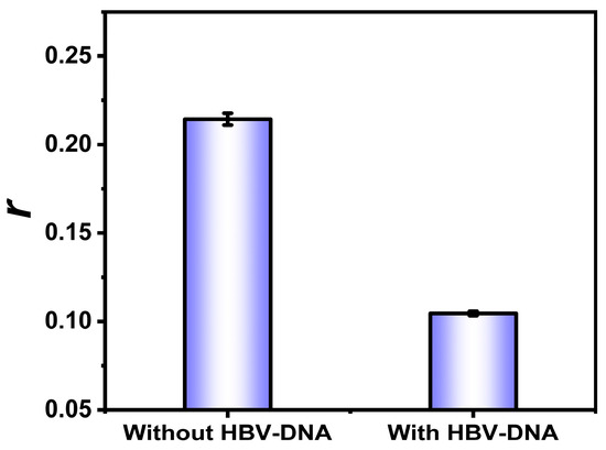 To investigate the feasibility of this method, we compared the response of r before and after adding HBV-DNA. As shown in Figure 4, r decreased significantly after adding HBV-DNA. This was because the addition of HBV-DNA activated CRISPR/Cas12a, which cut the DNA cross scaffolds. In contrast, in the absence of HBV-DNA, the complete structure of the DNA cross scaffold assembled into a larger structure with the TDF, producing a higher r. Therefore, this method detected HBV-DNA through a significantly decreased r.