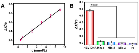 (A) Linear relationship between Δr/r0 and the concentration of HBV-DNA. (B) Selectivity of the method. Concentrations were as follows: Cas12a, 10 nmol/L; crRNA, 10 nmol/L; H1, 50 nmol/L; DNA cross scaffolds, 50 nmol/L; and TDFs, 50 nmol/L. The asterisk indicates significant differences with **** p < 0.0001.