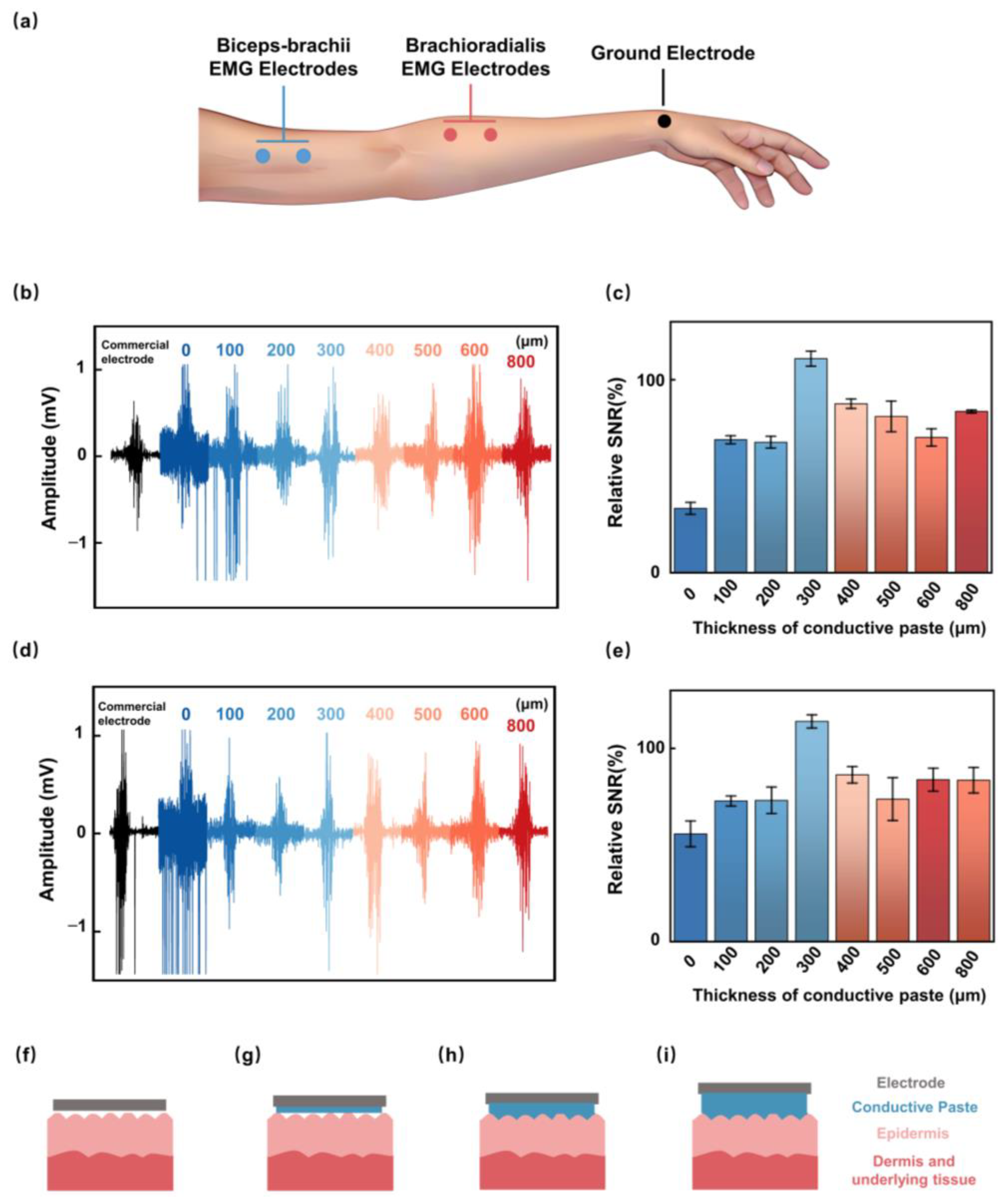 Figure 3. Effects of conductive paste thicknesses on electrical signal acquisition. (a) EMG signal acquisition setup. Electrode placement on the biceps brachii and brachioradialis muscles for recording EMG signals under varying conductive paste thicknesses. (b) Recorded EMG waveforms from the biceps brachii under different paste thicknesses, illustrating the impact on SNR. (c) Comparison of relative SNR (biceps brachii) for varying conductive paste thicknesses. (d) Recorded EMG waveforms from the brachioradialis under different paste thicknesses. (e) Comparison of relative SNR (brachioradialis) for varying conductive paste thicknesses. (f) Schematic of the electrode model without conductive paste, resulting in high impedance and poor SNR. (g) Schematic of the electrode model with insufficient conductive paste, leading to suboptimal SNR due to skin–electrode gaps. (h) Model with optimal conductive paste: schematic showing the electrode model with the optimal amount of conductive paste, providing low impedance and high SNR. (i) Schematic of the electrode model with excessive conductive paste, potentially causing electrode shorting and reduced SNR due to increased impedance. EMG: electromyography; SNR: signal-to-noise ratio.