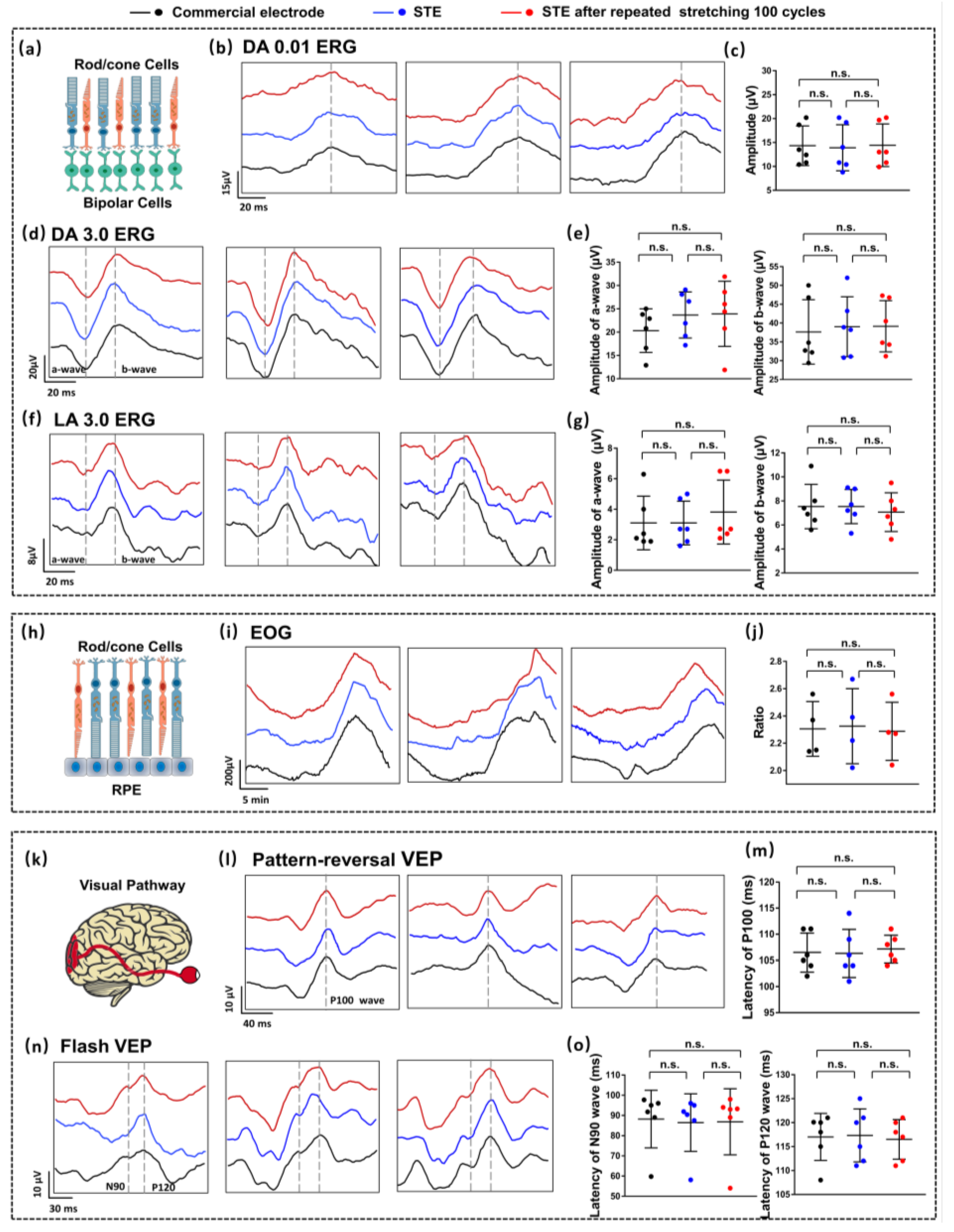 Figure 4. Clinical EP testing. (a) Schematic illustrating electrode placement and procedure for ERG, measuring retinal electrical activity in response to light stimuli. (b) ERG waveforms recorded under dark-adapted conditions (0.01 cd·s/m2) from stretched STE (red) after 100 cycles of 25% lateral strain, unstretched STE (blue), and Ag/AgCl electrodes (black). (c) Amplitude measurements from the DA 0.01 ERG tests across electrode types. (d) ERG waveforms recorded under dark-adapted conditions (3.0 cd·s/m2). (e) Amplitude measurements from the DA 3.0 ERG tests. (f) ERG waveforms recorded under light-adapted conditions (3.0 cd·s/m2). (g) Amplitude measurements from the LA 3.0 ERG tests. (h) EOG tests to assess the functional connection between RPE and photoreceptor cells. Standard waveforms exhibit a negative dark trough and a positive light peak. (i) EOG signals recordings from stretched STE, unstretched STE, and commercial Ag/AgCl electrodes. (j) Quantified ratios derived from the EOG tests. (k) Schematic illustrating electrode placement and procedure for VEP testing, evaluating the visual pathway’s response to visual stimuli. (l) VEP waveforms using a pattern-reversal stimulus, measured from different electrode types. (m) Latency measurements extracted from pattern-reversal VEP tests. (n) VEP waveforms recorded using a flash stimulus, illustrating the visual pathway’s response to brief visual stimuli. (o) Latency measurements extracted from flash VEP tests. Black dots and lines: commercial electrode testing results; blue dots and lines: STE testing results; red dots and lines: STE testing results after 100 stretching cycles. ERG: electroretinogram; EOG: electrooculography; VEP: visual evoked potential; STE: stretchable and transparent electrode; n.s. = no statistical difference, p > 0.05.