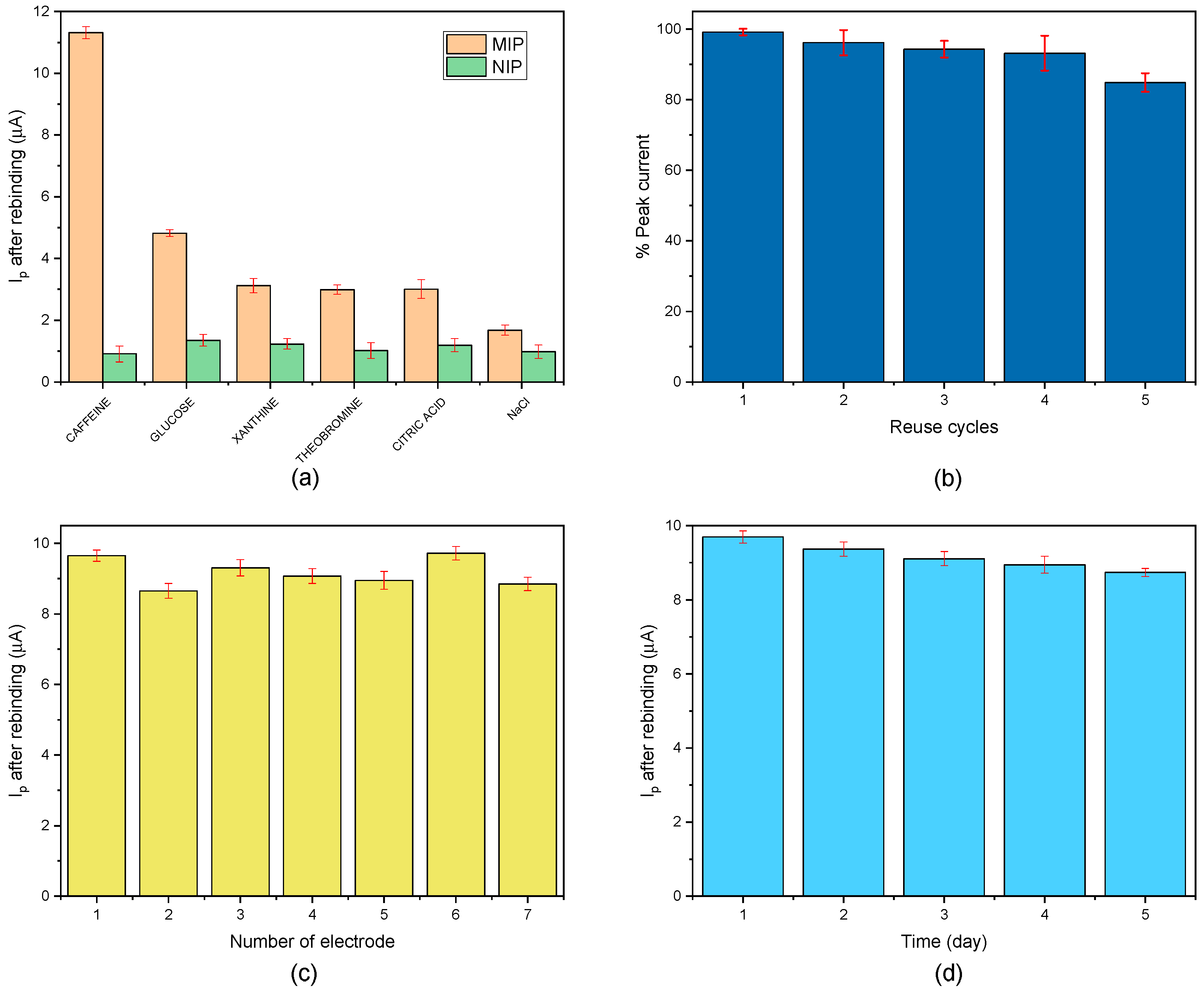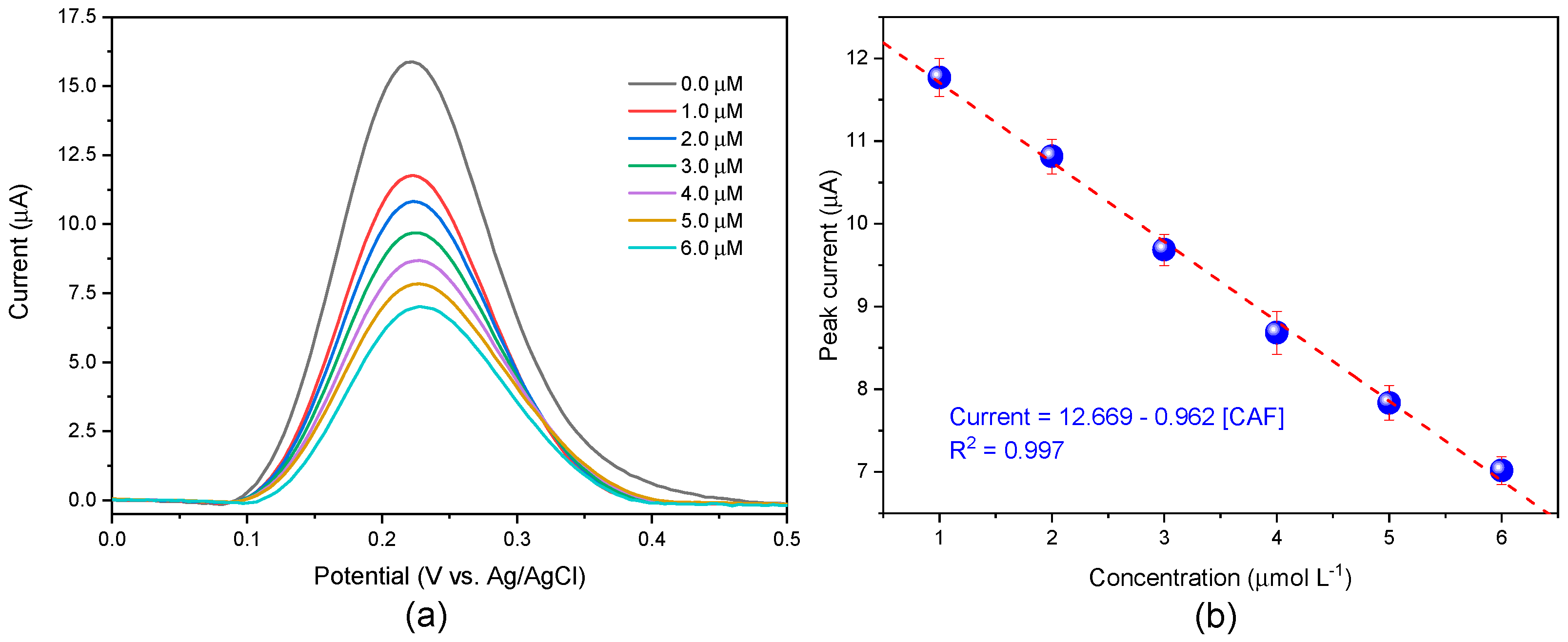 2.4. Quantification of Caffeine Using the Caffeine–MIP Electrochemical Sensor