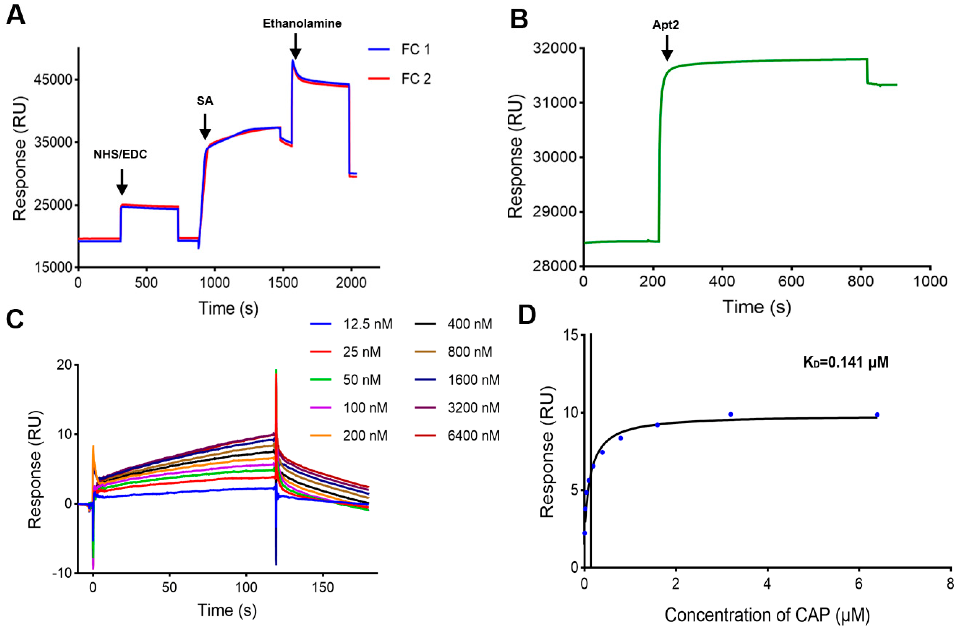 2.4.1. Immobilization of Apt2 and Apt3 on SA Chip