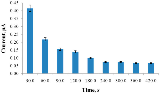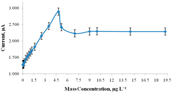 The current height of the oxidation peak of guanine and adenine residues increases with increasing ssDNA concentration up to 3.8 mg L−1. Above this value, saturation of the CPE surface is observed, and the current stabilizes. Thus, the concentration of 3.8 mg L−1 is chosen as the most appropriate for the following studies, since the electrode coverage is complete.