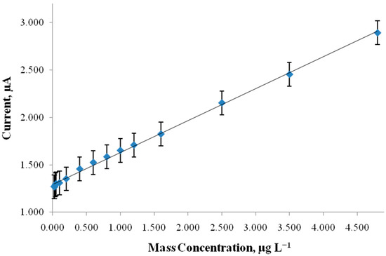 After optimizing the biosensor’s main parameters, a calibration curve was plotted (Figure 4). The results demonstrated that linearity was observed in the concentration range of 0.213–4.761 μg/L, while LOD equals 0.073 μg/L (in standard solutions) and the regression equation: y = 0.3371 (±0.0042)x + 1.2913 (±0.0075) (R2 = 0.9980). It must be noted that the detection limit was determined by 3 sb/slope where sb is the standard deviation of the blank measurements and the slope of the calibration curve.