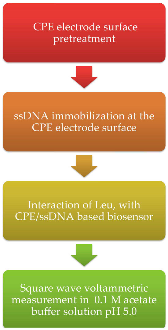 In this context, the objective of the proposed study is the development of an electrochemical ssDNA biosensor for the detection of leucine. For the first time, the interaction between the amino acid leucine (Leu) and thermally denatured single-stranded (ss) DNA has been demonstrated by applying voltammetry. As a result of the interaction, the characteristic peak of ssDNA, due to the oxidation of guanine residues, was exploited for the development of a promising sensor. In particular, in this study, the methodology of preparation, their voltammetric behavior, the conditions of DNA immobilization, and the analytical characteristics of the sensor were studied.