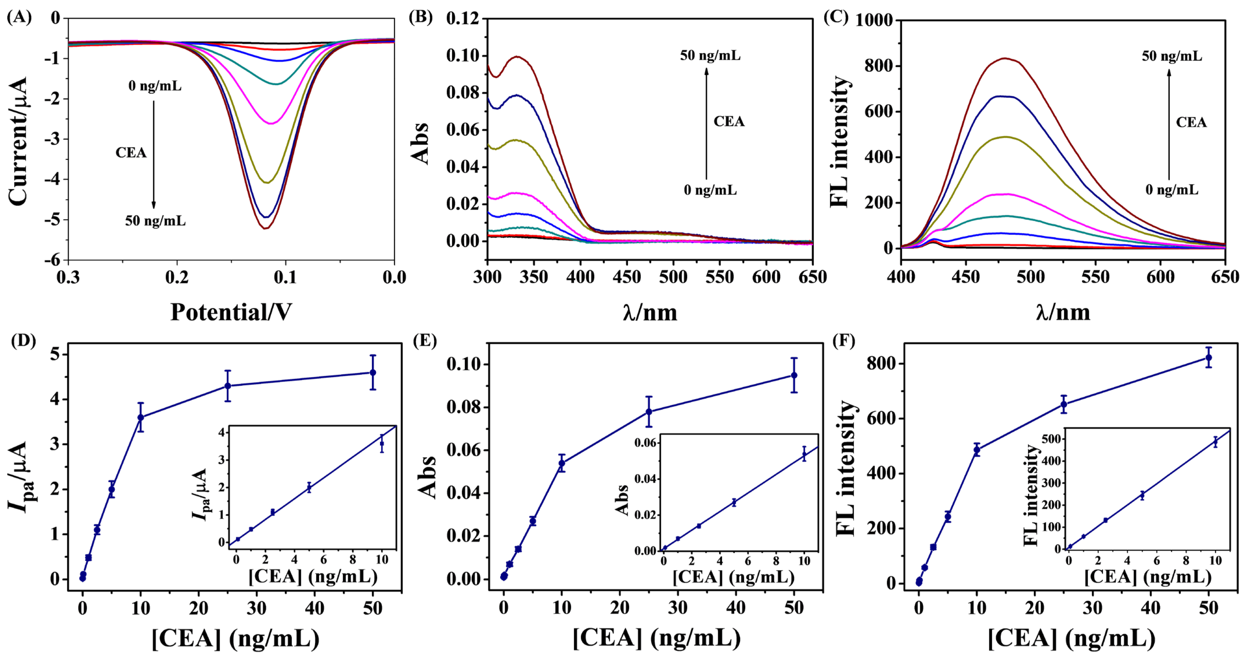 | DPV, UV-vis, fluorescence | Cu-PQQ | Acetic acid | CEA | 0.1–10 | 0.01, 0.1, 0.1 | This work |