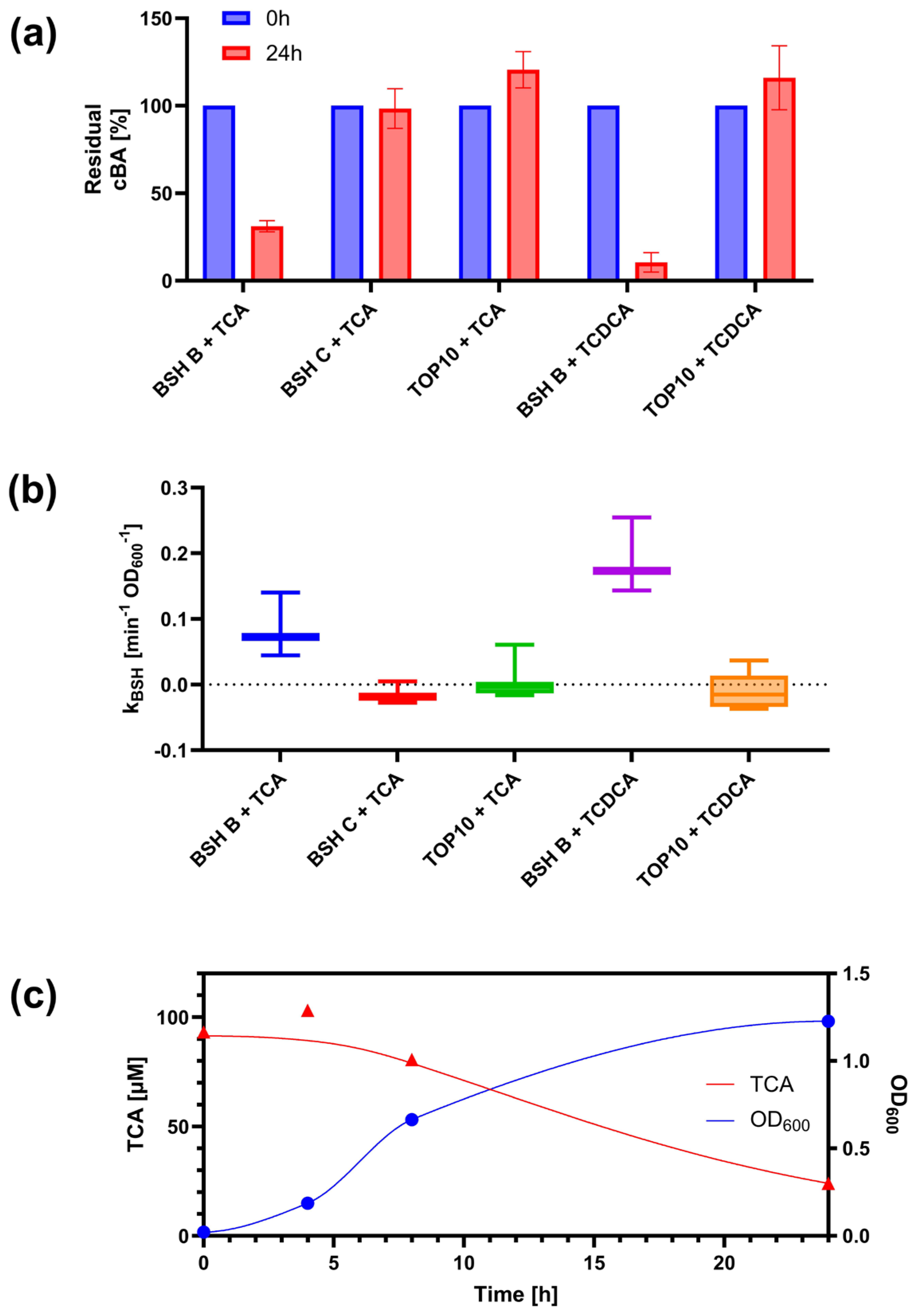 - Brandvold, K.R.; Weaver, J.M.; Whidbey, C.; Wright, A.T. A continuous fluorescence assay for simple quantification of bile salt hydrolase activity in the gut microbiome. Sci. Rep. 2019, 9, 1359. [Google Scholar] [CrossRef] [PubMed]