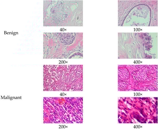 The BreakHis dataset [8] is a widely utilized public resource comprising microscopic biopsy images of benign and malignant breast tissues. Collected by the P&D Laboratory in Brazil, all patient data within the dataset has been anonymized. It features breast tissue samples obtained via surgical open biopsy, with expert pathologists providing the corresponding labels. The dataset consists of 7909 images, each with a resolution of 700 × 460 pixels, and is categorized into four magnification levels: 40×, 100×, 200×, and 400×. As shown in Table 1, each magnification level contains approximately 2000 images. The dataset is further partitioned into training, validation, and test sets for model evaluation. Despite its value in medical imaging research, BreakHis poses two significant challenges for deep learning models. Firstly, its relatively small size increases the risk of overfitting. Secondly, a notable class imbalance exists at each magnification level, with malignant samples being nearly twice as numerous as benign ones, which can affect model performance. As illustrated in Figure 1, representative histopathological images of benign and malignant breast tissues are shown for each magnification level (40×, 100×, 200×, and 400×), providing a visual overview of the dataset.