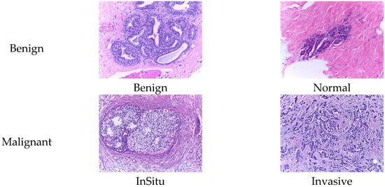 The BACH dataset [24] was introduced as part of the 2018 ICIAR (International Conference on Image Analysis and Recognition) competition. All images were acquired under consistent conditions using a 200× magnification and were meticulously annotated by two expert pathologists. This dataset comprises 400 Hematoxylin-Eosin stained breast histopathology images, classified into two primary categories: Non-Carcinoma (Benign) and Carcinoma (Malignant). Additionally, these are further divided into four subtypes: Normal, Benign, In Situ Carcinoma, and Invasive Carcinoma. The specific distribution of the dataset is presented in Table 2. As shown in Figure 2, representative histopathological images of the four subtypes in the BACH dataset—Normal, Benign, In Situ Carcinoma, and Invasive Carcinoma—are presented, providing a visual overview of the dataset.